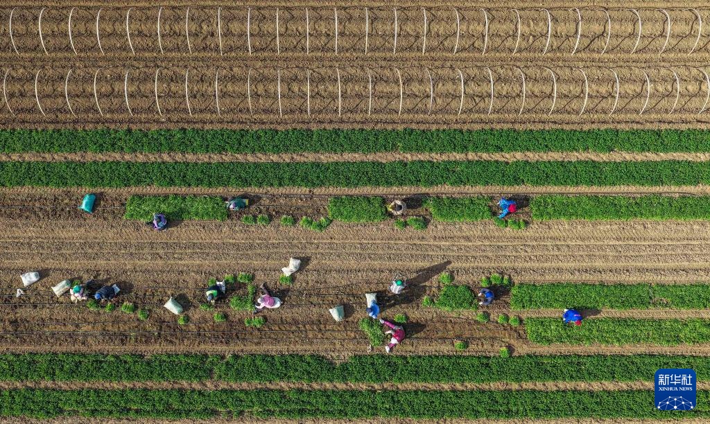 11月18日,河北省唐山市玉田县虹桥镇农人在田间收成香菜(无人机相片)。