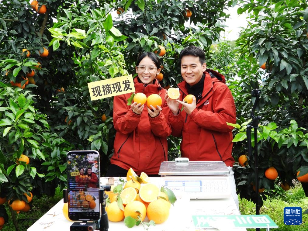 11月18日,在四川省达州市渠县合力镇石燕村柑桔栽培基地,工作人员线上直播出售脐橙。