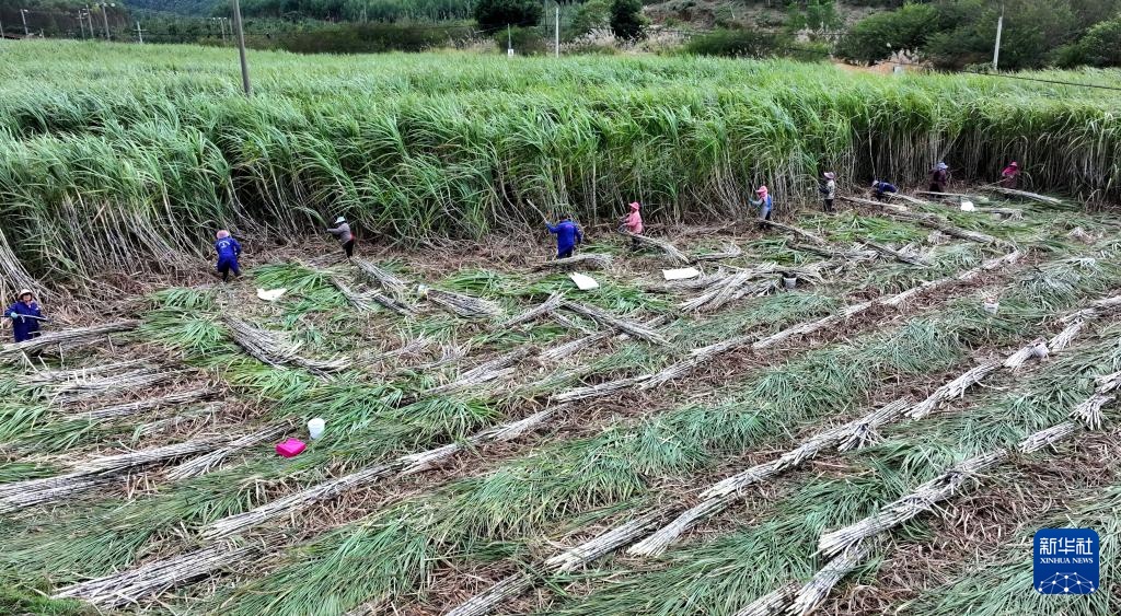 11月18日,在广西壮族自治区柳州市柳城县龙头镇,蔗农在地里砍收甘蔗(无人机相片)。