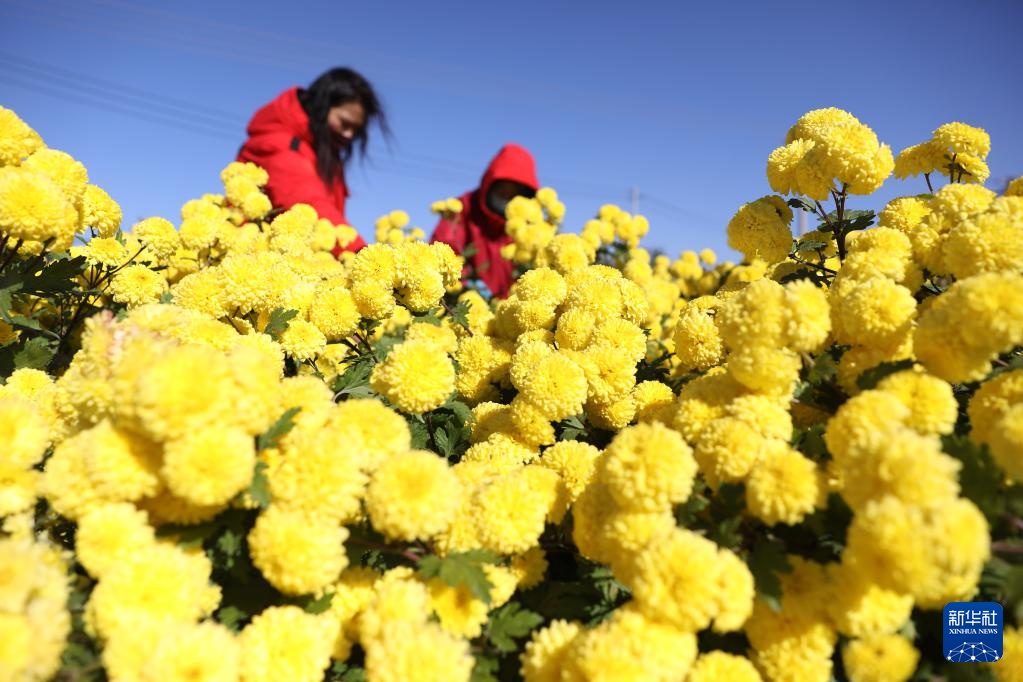 11月18日,河南省焦作市温县黄河大街下石井村一家怀药栽培专业合作社职工在采收怀菊花。